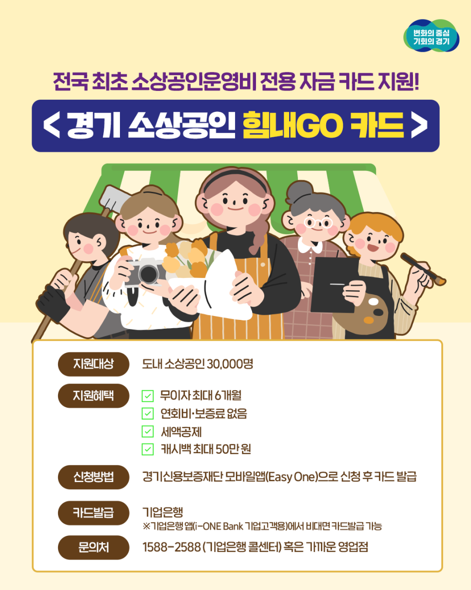 경기 소상공인 힘내GO 카드는 경기도 소상공인을 위한 운영비 지원 카드입니다. 무이자 6개월 할부, 연회비·보증료 무료, 3% 캐시백(연간 10만 원, 최대 5년), 세액 공제 혜택으로 사업 부담을 줄여줍니다. 신용점수 595점 이상, 경기도 내 소상공인 3만 명이 대상이며, 법인기업은 지원 불가합니다.